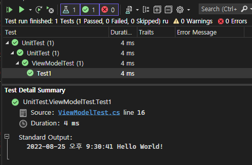 UnitTest1.cs 를 삭제 하고 ViewModelTest.cs 를 추가 하자