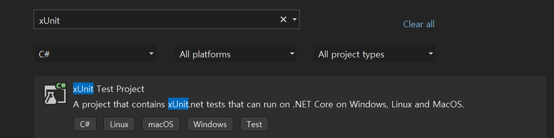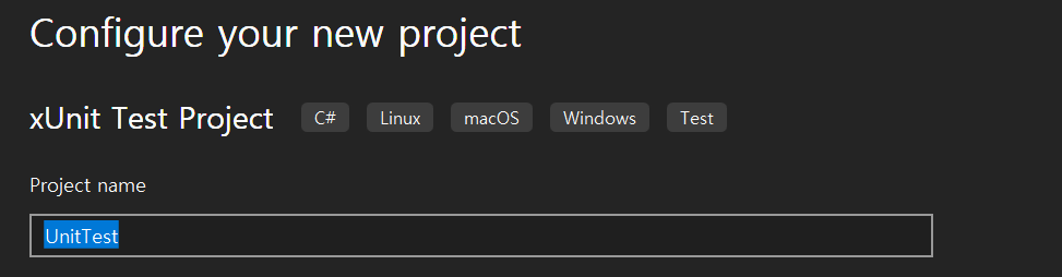 Solution --> add --> new project --> xUnit Test Project 선택 --> Next