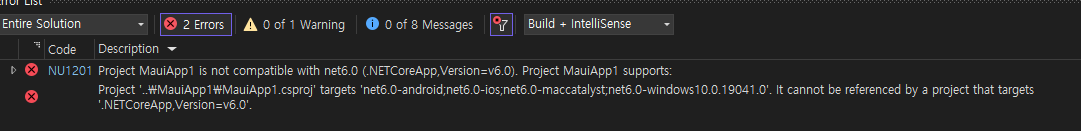 Error NU1201 Project MauiApp1 is not compatible with net6.0 (.NETCoreApp,Version=v6.0). Project MauiApp1 supports: