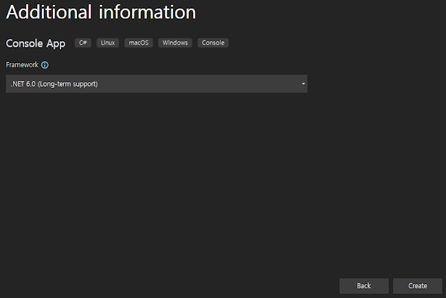 Framework 를 dotnet 6 로 지정 한 후 Create 를 클릭한다.